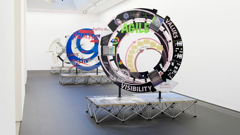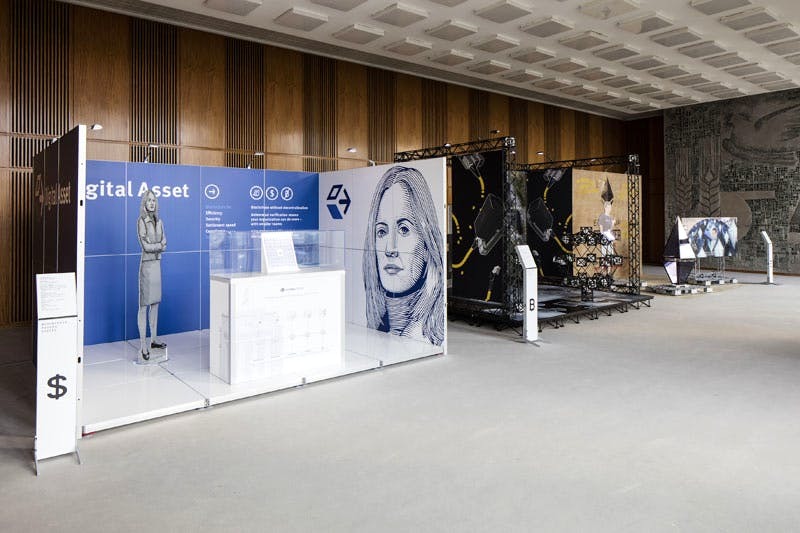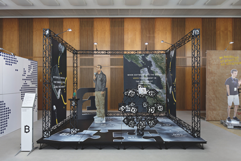 Simon Denny, Blockchain Visionaries, 2016, Ausstellungsansicht The Present in Drag, 9. Berlin Biennale, ESMT European School of Management and Technology, Berlin, 2016, Foto: Hans-Georg Gaul, Quelle: zerodeux.fr