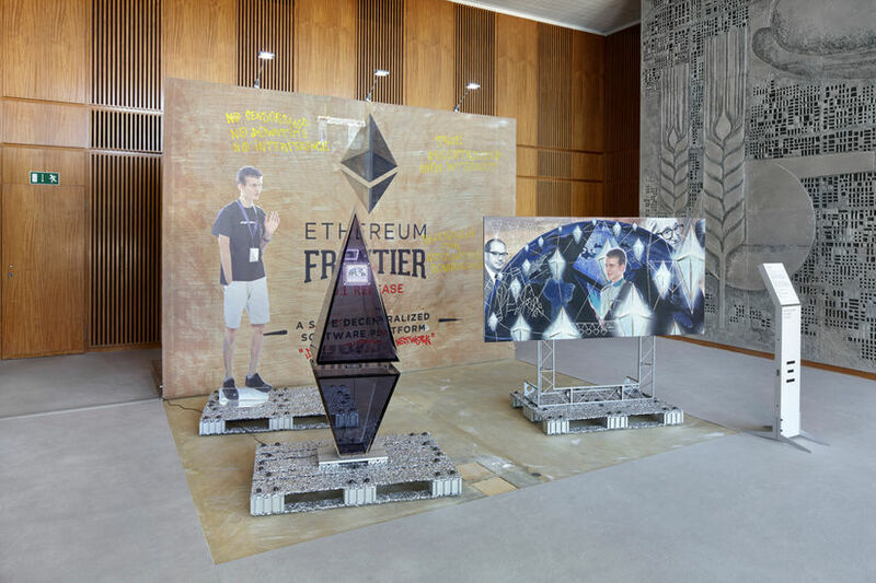 Simon Denny, Blockchain Visionaries, 2016, Ausstellungsansicht The Present in Drag, 9. Berlin Biennale, ESMT European School of Management and Technology, Berlin, 2016, Foto: Timo Ohler, Quelle: Apollo-magazine.com