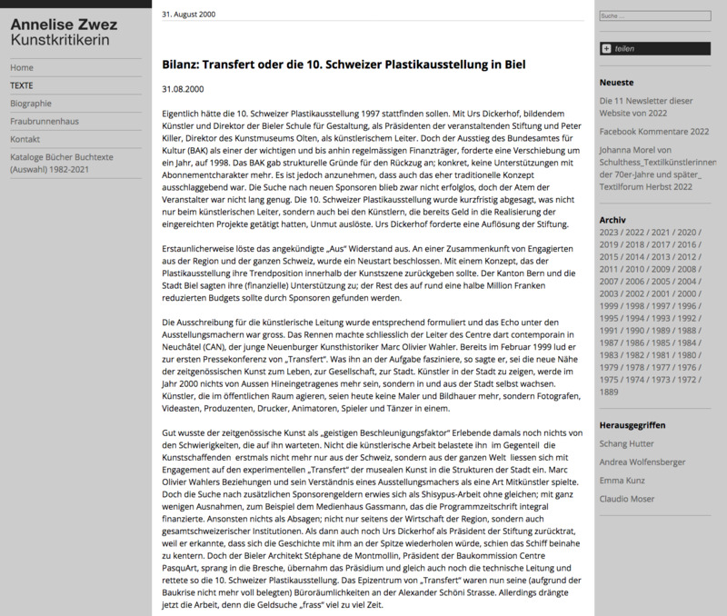 Annelise Zwez, Bilanz: Transfert (2000)