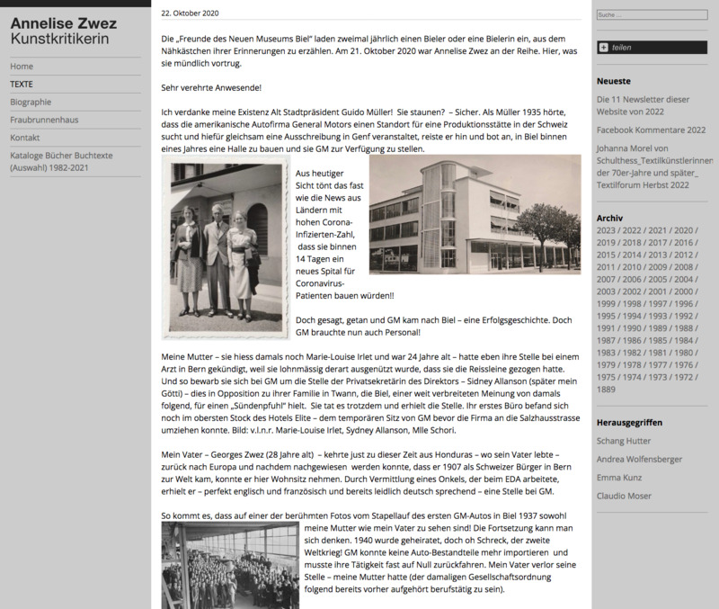 Annelise Zwez, Biel erzählt (2020), Rede im Neuen Museum Biel