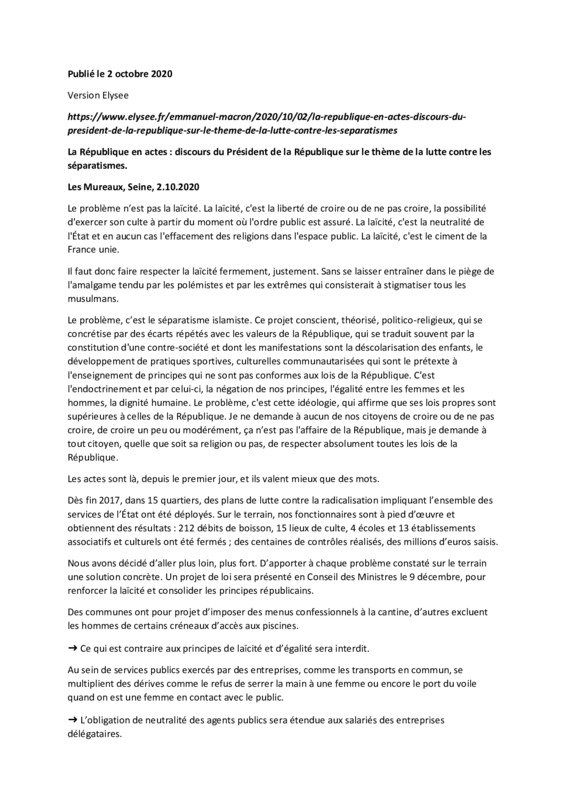 La République en actes : discours du Président de la République sur le thème de la lutte contre les séparatismes. Les Mureaux, 2.10.2020