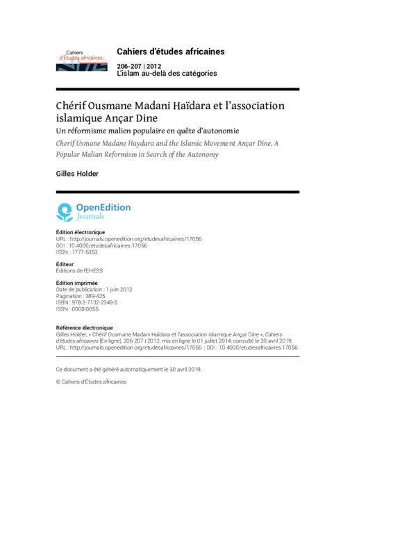 Chérif Ousmane Madani Haïdara et l’association islamique Ançar Dine. Un réformisme malien populaire en quête d’autonomie