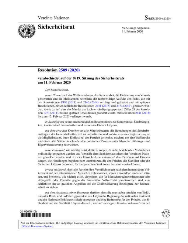 Resolution 2509 (2020) verabschiedet auf der 8719. Sitzung des Sicherheitsrats am 11. Februar 2020
