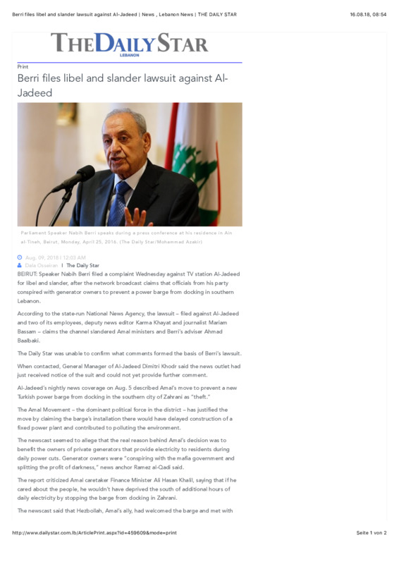 Berri files libel and slander lawsuit against Al-Jadeed