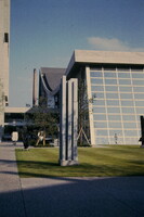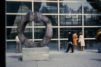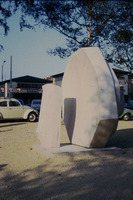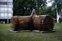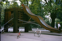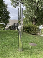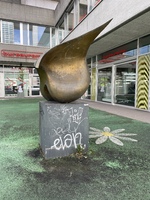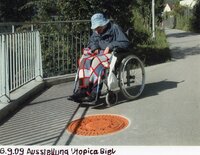 Frau im Rollstuhl blickt auf die Skulptur. Die Intervention des Kunstkollektivs State of Sabotage wurde von der Stadt Biel erworben und befindet sich noch heute am ursprünglichen Ausstellungsort, in der Verlängerung des Holunderweg.