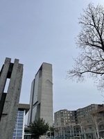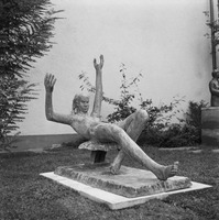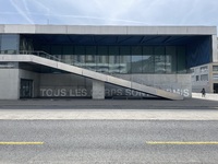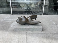 Liegend bettet sich die Bronzeplastik „Kyra“ neben dem Eingang auf dem Vorplatz des Bieler Kongresshauses. Die nahe Platzierung der Skulptur von Max Weiss an der Fensterfassade des Kongresshauses nimmt die Plastik förmlich auf.